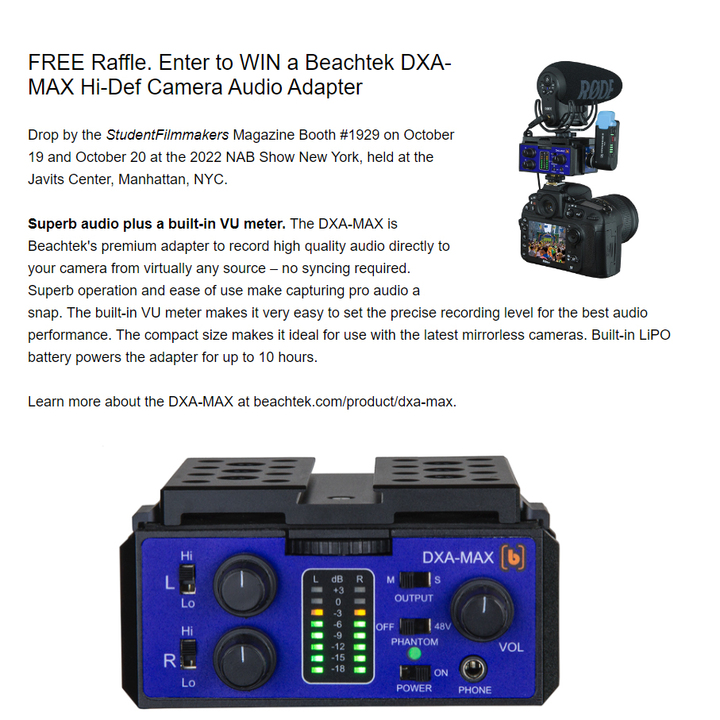 Drop by the StudentFilmmakers Magazine Booth #1929 on October 19 and October 20 at the 2022 NAB Show New York, held at the Javits Center, Manhattan, NYC.